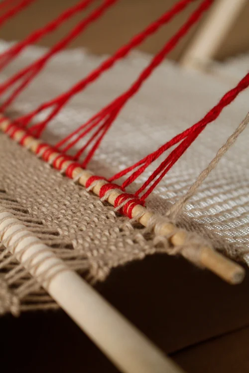 The weaving was split into three primary sections, each trying a different technique of “structural weaving”. The first was a simple slatted structure tied onto the weft threads running bellow it. The second, and largest, section was composed of a mast like construction held upright by a hand tied net. The third, and final, section used a leno technique to bind wood slats into the structure.